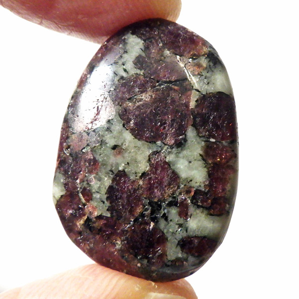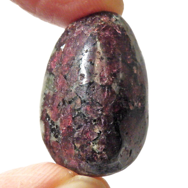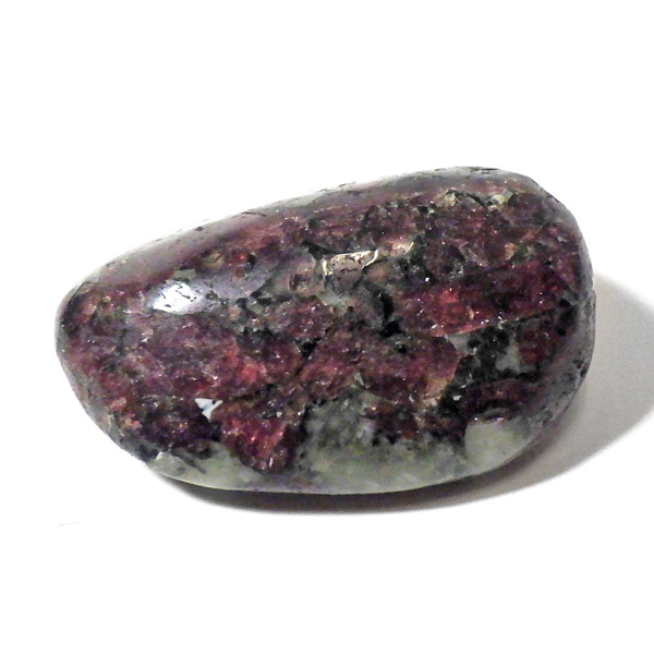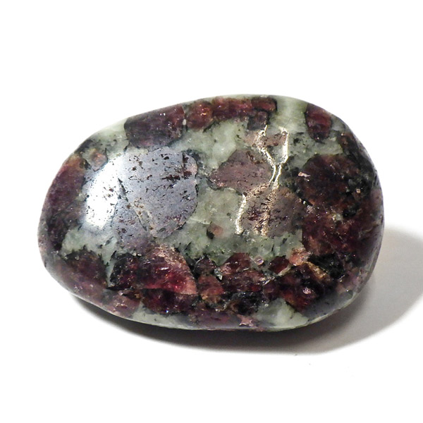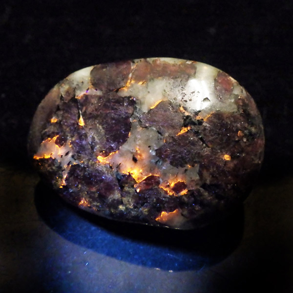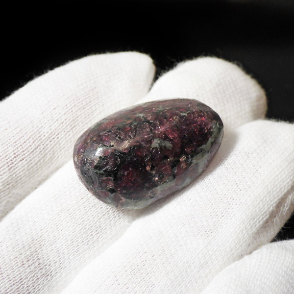 ロシア産のユーディアライト、タンブルです。産出量の少ない希少な石。深いワインレッドとキラキラとした結晶がとてもきれいで、神秘的な輝きを放ちます。赤い色が鮮やかであるほど貴重で、産地であるロシア・ラップランドではラップランドのルビーという愛称があります。ユーディアライトではない母岩部分(おそらくソーダライト)が365nmの波長で蛍光しました。