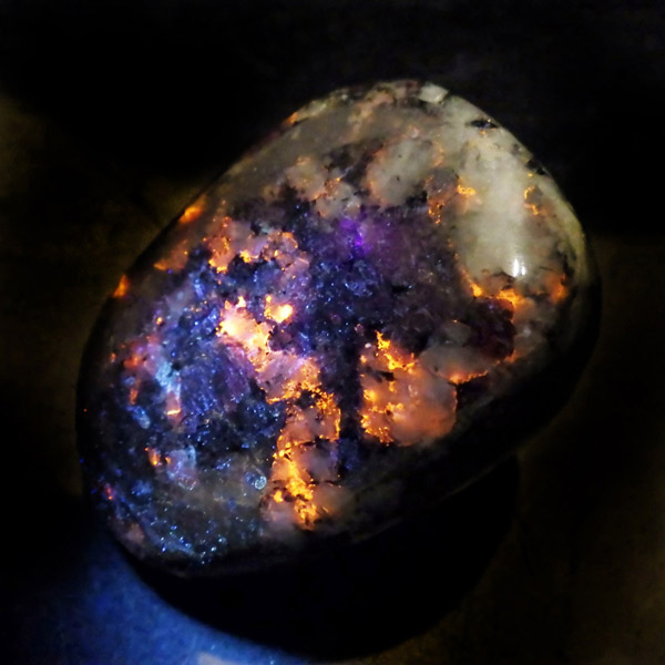 ロシア産のユーディアライト、タンブルです。産出量の少ない希少な石。深いワインレッドとキラキラとした結晶がとてもきれいで、神秘的な輝きを放ちます。赤い色が鮮やかであるほど貴重で、産地であるロシア・ラップランドではラップランドのルビーという愛称があります。ユーディアライトではない母岩部分(おそらくソーダライト)が365nmの波長で蛍光しました。