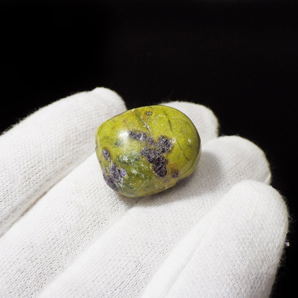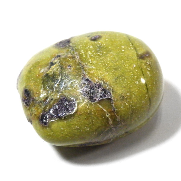 オーストラリア産のアトランティサイト、タンブルです。 鮮やかな黄緑のサーペンティン(リザーダイト)に、またまた鮮やかな紫色のスティヒタイトが点々と彩りを添え、色彩のハーモニーが美しく印象的です。