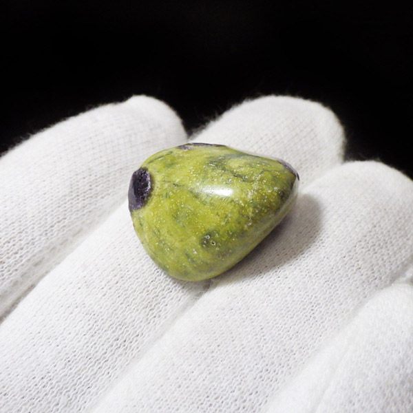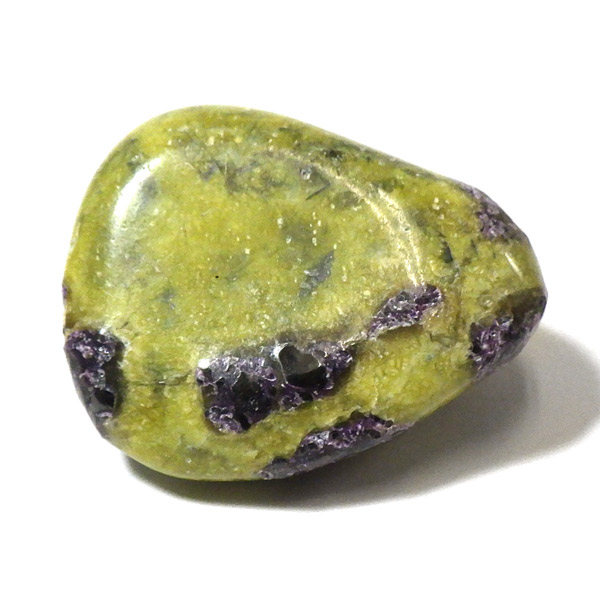 オーストラリア産のアトランティサイト、タンブルです。 鮮やかな黄緑のサーペンティン(リザーダイト)に、またまた鮮やかな紫色のスティヒタイトが点々と彩りを添え、色彩のハーモニーが美しく印象的です。