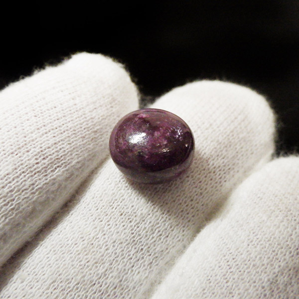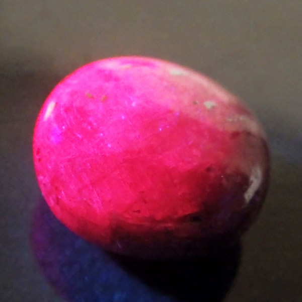 インド産ルビーのタンブルです。ルビーは三大色石としてエメラルド、サファイア、ルビーと誰もが名前を知っていますね。赤系の石、特にルビーはとても貴重な天然石です。365nmの波長のUVライトを照射することでルビーレッドが鮮やかに蛍光します。
