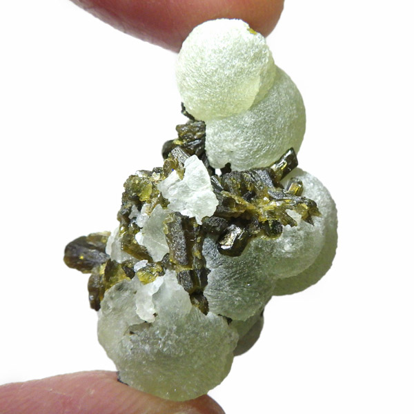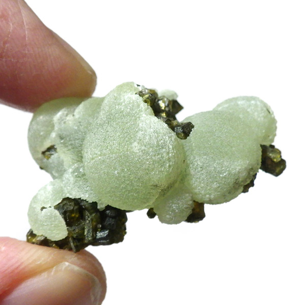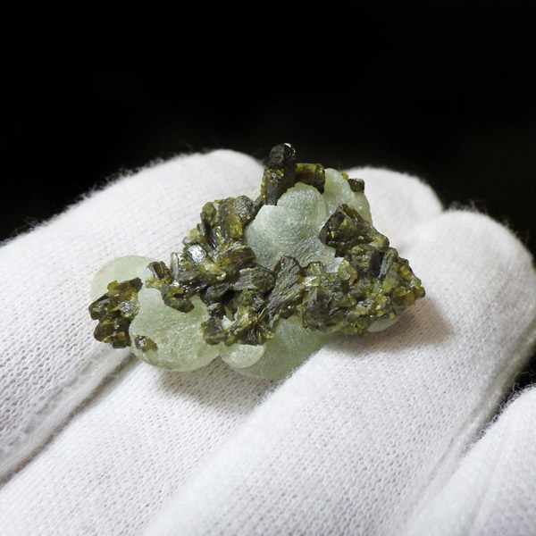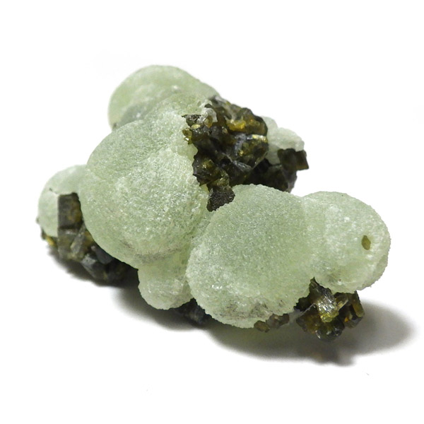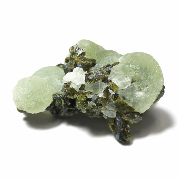 コロッとした形が可愛らしマリ共和国産のプレナイト with エピドート原石です。 ぶどうのように見えることから、和名でぶどう石(葡萄石)と呼ばれています。 優しい黄緑色の色彩で透明度が高いことが特徴です。 母岩にはプレナイトの内包物として良く見られる、深緑の針柱状の鉱物、エピドート(緑簾石)が共生しています。形も良くかわいらしいプレナイトです。