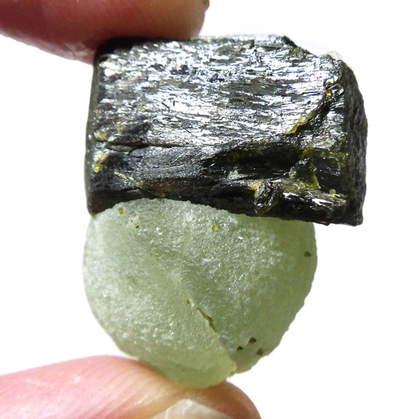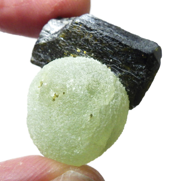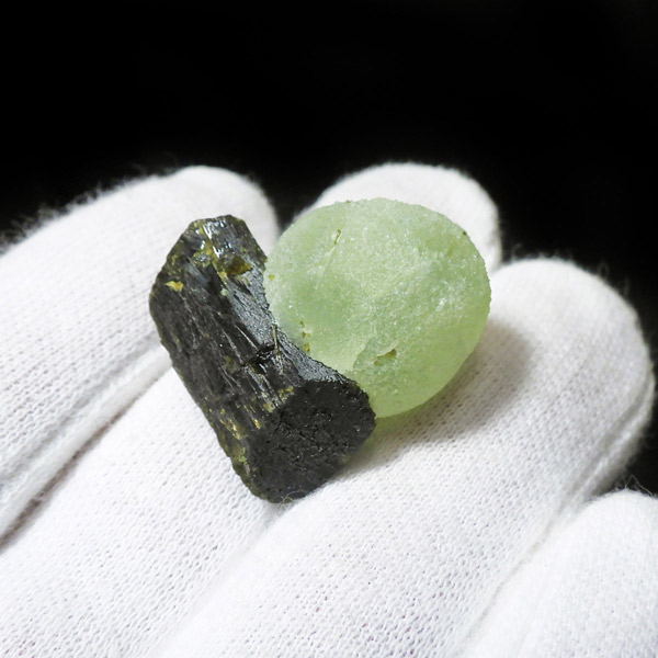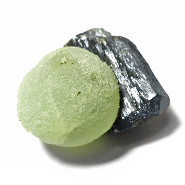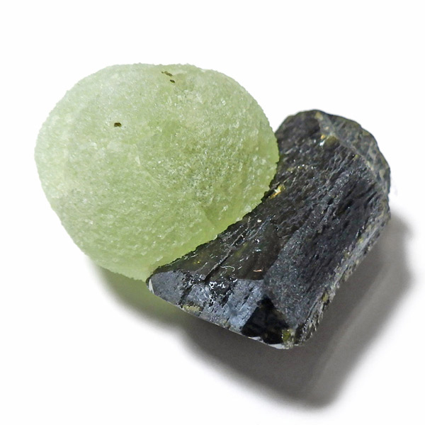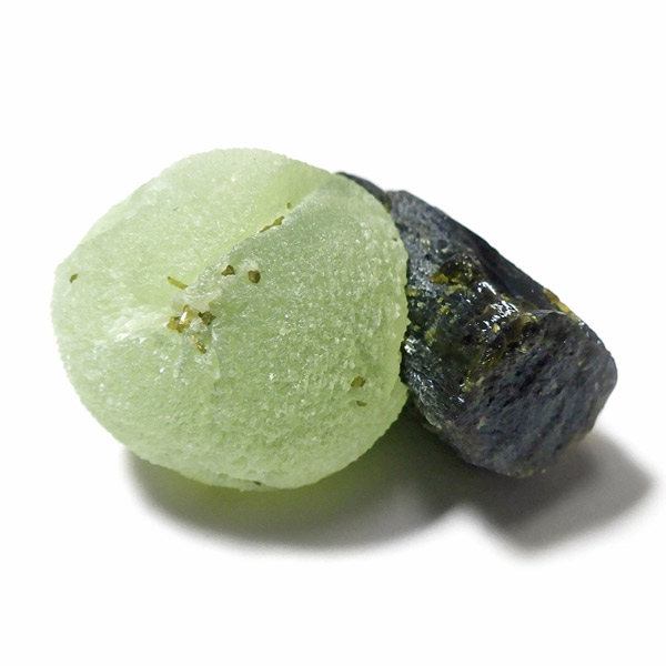 コロッとした形が可愛らしマリ共和国産のプレナイト with エピドート原石です。 ぶどうのように見えることから、和名でぶどう石(葡萄石)と呼ばれています。 優しい黄緑色の色彩で透明度が高いことが特徴です。 母岩にはプレナイトの内包物として良く見られる、深緑の針柱状の鉱物、エピドート(緑簾石)が共生しています。形も良くかわいらしいプレナイトです。