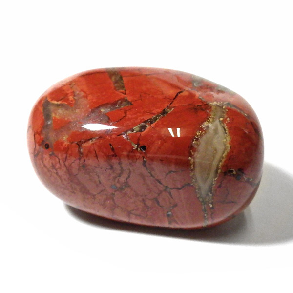 ブラジル産のポピージャスパー、タンブルです。 ジャスパーは、様々な不純物を含んだ石英の総称で、含まれる不純物によって、赤、緑、黄、黒、褐色など、多くの色や模様を持ちます。古くから「聖なる石」と崇められてきた鉱物で、太陽崇拝のインカ帝国では、レッドジャスパーが生命の源の石としてまつりに使用されていたそうです。このポピージャスパーは鮮やかで艶があり、石英によって独特の模様が楽しめます。