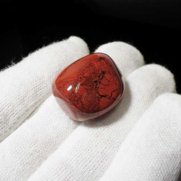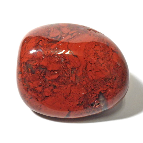 ブラジル産のポピージャスパー、タンブルです。 ジャスパーは、様々な不純物を含んだ石英の総称で、含まれる不純物によって、赤、緑、黄、黒、褐色など、多くの色や模様を持ちます。古くから「聖なる石」と崇められてきた鉱物で、太陽崇拝のインカ帝国では、レッドジャスパーが生命の源の石としてまつりに使用されていたそうです。このポピージャスパーは鮮やかで艶があり、石英によって独特の模様が楽しめます。