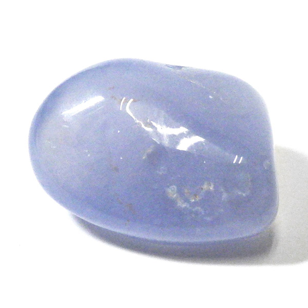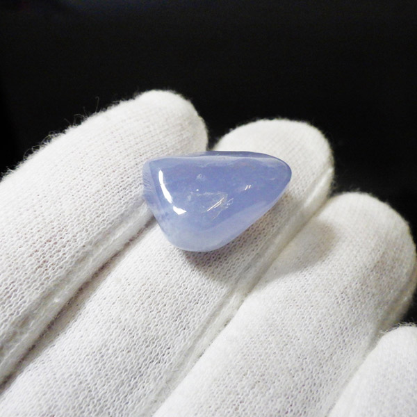 トルコ産のブルーカルセドニー、タンブルです。カルセドニーはアゲートとよく似ており、いろいろな色が混ざっており、模様があるものがアゲート、色が均一で模様がないものがカルセドニー分類されています。カルセドニーのグループにはカーネリアンやクリソプレーズなど鮮やかな石があるのは有名です。こちらのブルーカルセドニーは落ち着いたブルーの天然の発色で、光に透かした透過光は赤みを帯びたミルキーな色味があります。カルセドニーの産地でも白っぽいライトなブルーカルセドニーなども多く、ブルーカルセドニーの中でも発色が良く、高品質なタンブルです。