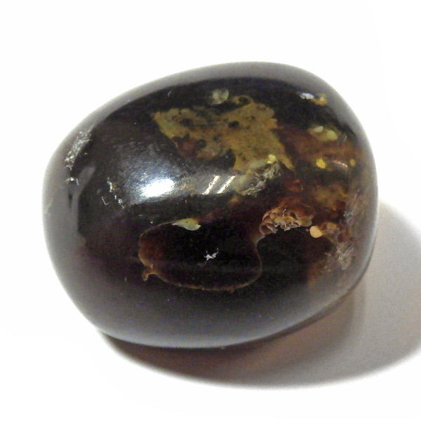 インドネシア産のアンバー(琥珀)、タンブルです。 松柏類の樹脂が3000万年以上の時を経て化石化したものです。 アンバーという名前は、古代アラビア語の「アンバール(海に漂うもの)」が由来です。インドネシアのスマトラで採取されるアンバーは石炭層の中から採れるのが特徴で、落ち着いた色合いのものが多いです。ブランデーのような深い色合いのアンバー内に斑点に似た濃い色の部分が見られます。スマトラアンバーは白熱光の下では赤みがかった色合いを示し、ブラックライトなどを使い、紫外線の下では青い蛍光を示す光学的特徴も持っています。色が綺麗なことはもちろん光を通しても綺麗で美しいです。