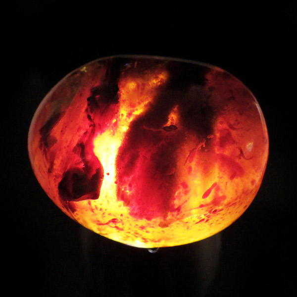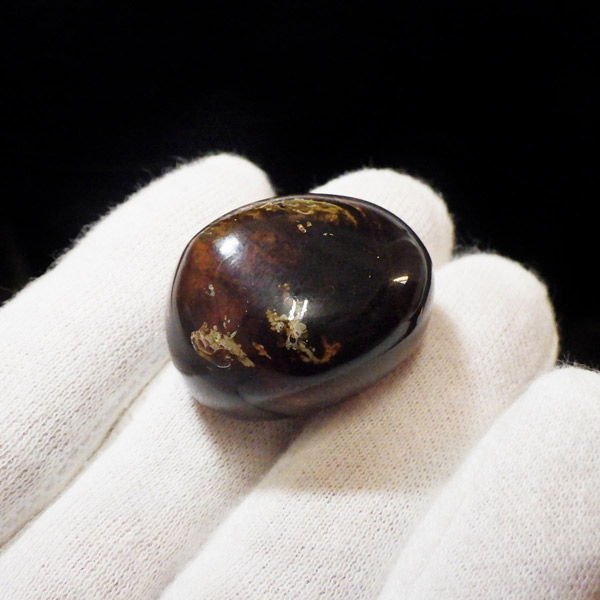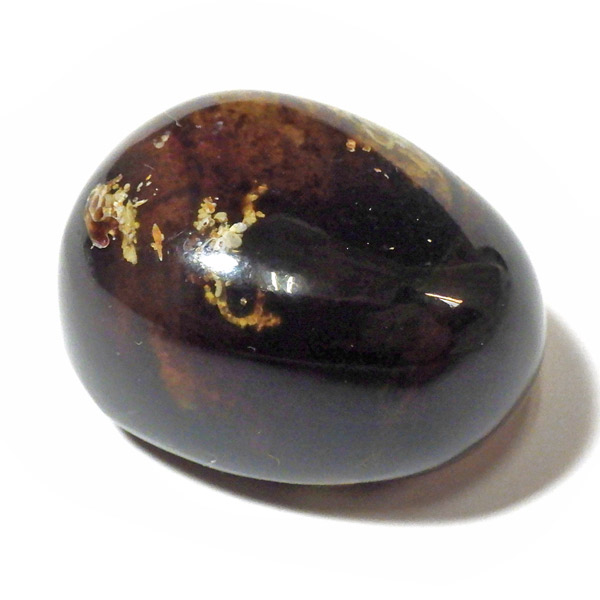 インドネシア産のアンバー(琥珀)、タンブルです。 松柏類の樹脂が3000万年以上の時を経て化石化したものです。 アンバーという名前は、古代アラビア語の「アンバール(海に漂うもの)」が由来です。インドネシアのスマトラで採取されるアンバーは石炭層の中から採れるのが特徴で、落ち着いた色合いのものが多いです。ブランデーのような深い色合いのアンバー内に斑点に似た濃い色の部分が見られます。スマトラアンバーは白熱光の下では赤みがかった色合いを示し、ブラックライトなどを使い、紫外線の下では青い蛍光を示す光学的特徴も持っています。色が綺麗なことはもちろん光を通しても綺麗で美しいです。