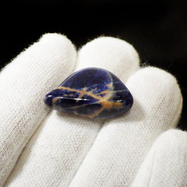 インド産のサンセットソーダライト、タンブルです。サンセットソーダライトは可愛いオレンジが入ったソーダライトです。ソーダライトはブルーが象徴的な石ですが、そこにオレンジ色のゼオライトが入り込み、この様な鮮やかなバイカラーストーンになります。まだ流通量が少なく、知る人ぞ知るパワーストーンとして人気があります。 晴れた青空が夕方を迎えて、少しづつ夕陽に染まりゆく僅かな時間・・・そんなイメージから サンセットソーダライトと呼ばれたのだと思います。