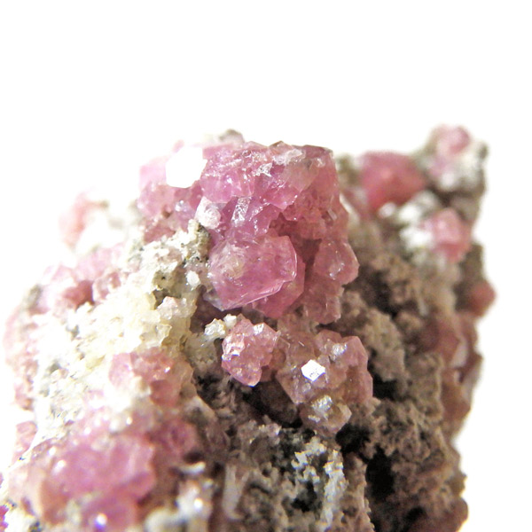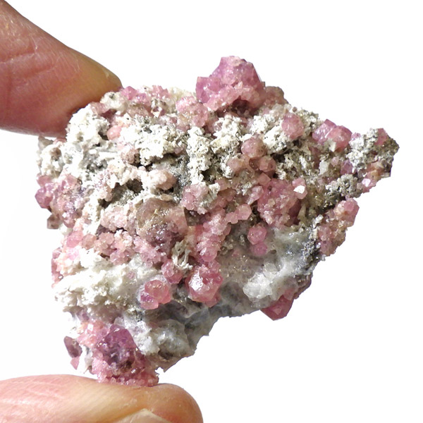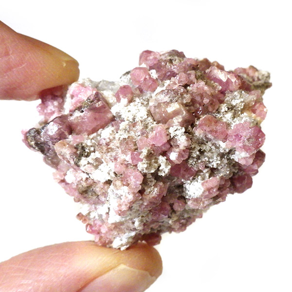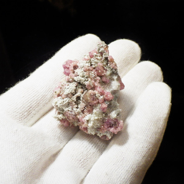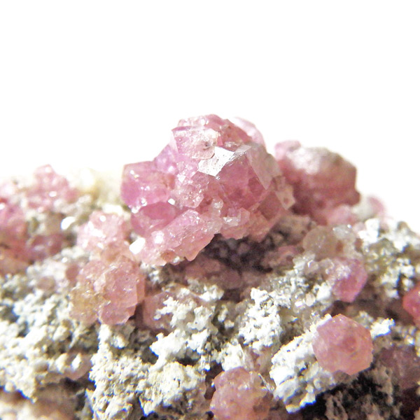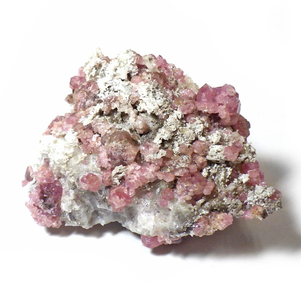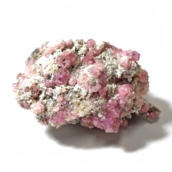 メキシコ産ピンクガーネット原石です。ガーネットというと「赤」という印象が強いですが、純粋なものは紫色をしており、その他にも40種類以上もの色があります。その中の一種で、メキシコ産のピンク色をしたものをピンクガーネット(ローゼライト)と呼びます。きれいなピンク色をした結晶が母岩にびっしりと分布しており、大変良い原石です。