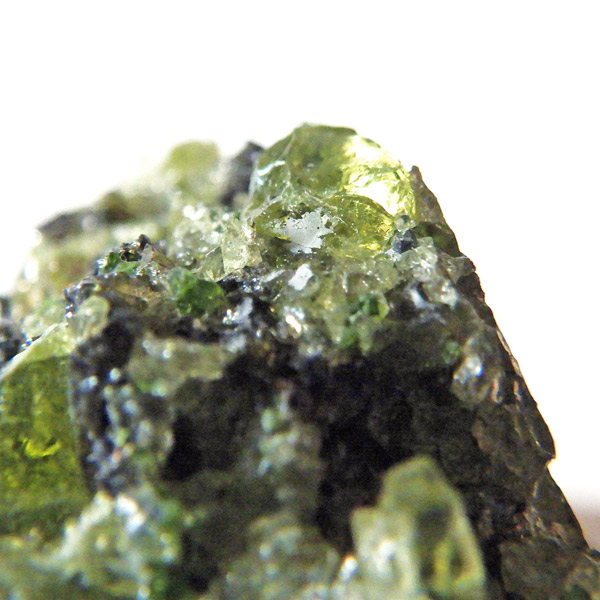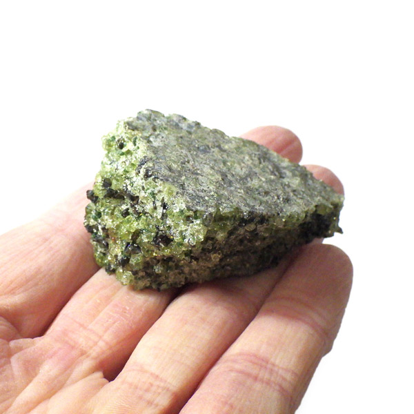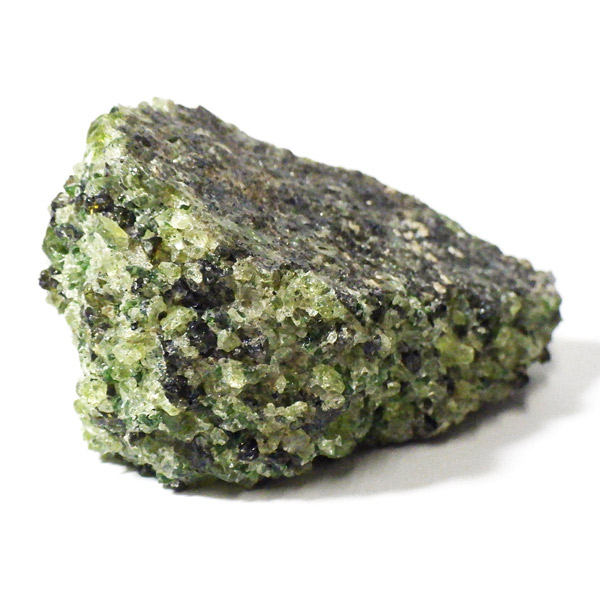 アメリカ・アリゾナ州産のペリドット(ペリドタイト)母岩付き原石です。鉱物名をオリビンと呼ぶのですが、日本では宝石名のペリドットが浸透しています。和名は橄欖(かんらん)石といいます。主にグリーンの結晶がかんらん石でチャコールグレーの母岩が玄武岩です。かんらん石は月の岩石や石質隕石、石鉄隕石にも含まれており、鉄の含有量によって、白色から黒色まで色調が変化します。かんらん石は地球の上部マントルの主要構成鉱物でマグマの噴火によって溶岩の塊に運ばれて地表に出てきます。まさにその姿を切り取ったようなこの原石は、様々な濃淡の結晶が多面にわたり観察できます。