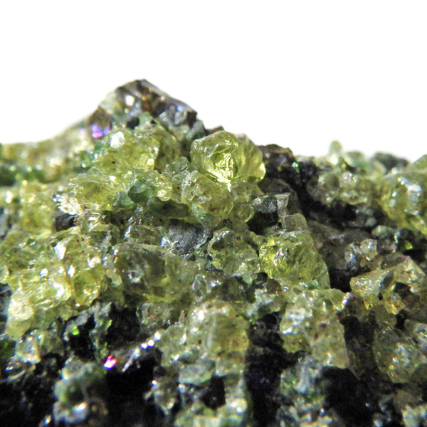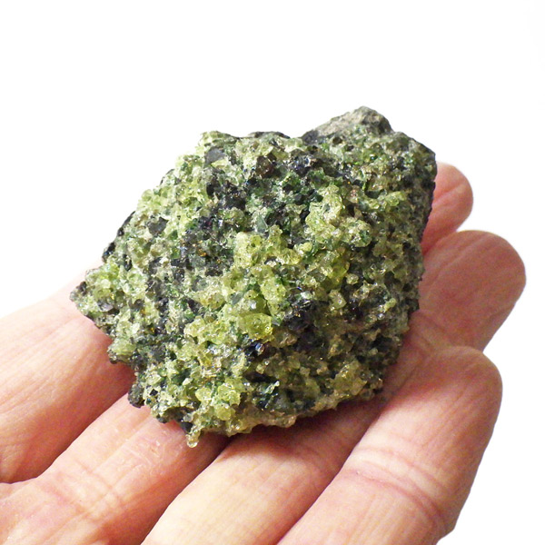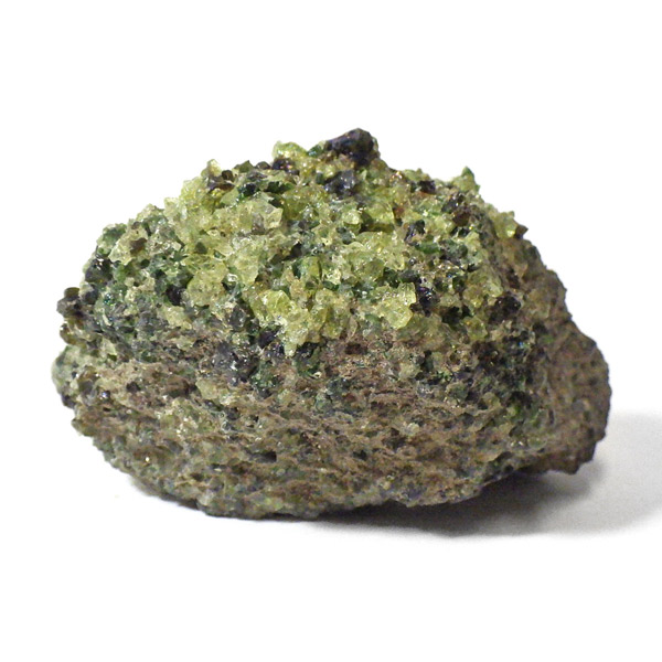 アメリカ・アリゾナ州産のペリドット(ペリドタイト)母岩付き原石です。鉱物名をオリビンと呼ぶのですが、日本では宝石名のペリドットが浸透しています。和名は橄欖(かんらん)石といいます。主にグリーンの結晶がかんらん石でチャコールグレーの母岩が玄武岩です。かんらん石は月の岩石や石質隕石、石鉄隕石にも含まれており、鉄の含有量によって、白色から黒色まで色調が変化します。かんらん石は地球の上部マントルの主要構成鉱物でマグマの噴火によって溶岩の塊に運ばれて地表に出てきます。まさにその姿を切り取ったようなこの原石は、様々な濃淡の結晶が多面にわたり観察できます。
