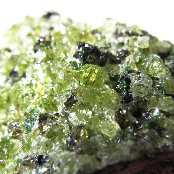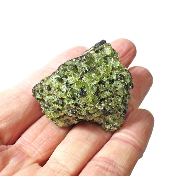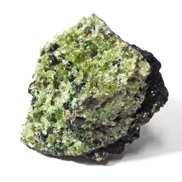 アメリカ・アリゾナ州産のペリドット(ペリドタイト)母岩付き原石です。鉱物名をオリビンと呼ぶのですが、日本では宝石名のペリドットが浸透しています。和名は橄欖(かんらん)石といいます。主にグリーンの結晶がかんらん石でチャコールグレーの母岩が玄武岩です。かんらん石は月の岩石や石質隕石、石鉄隕石にも含まれており、鉄の含有量によって、白色から黒色まで色調が変化します。かんらん石は地球の上部マントルの主要構成鉱物でマグマの噴火によって溶岩の塊に運ばれて地表に出てきます。まさにその姿を切り取ったようなこの原石は、様々な濃淡の結晶が多面にわたり観察できます。