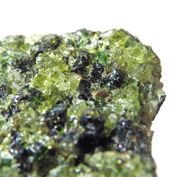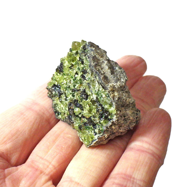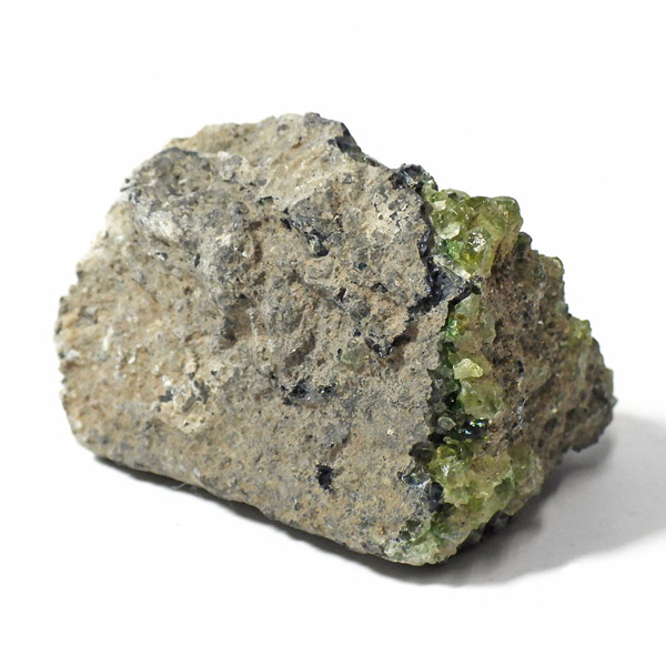 アメリカ・アリゾナ州産のペリドット(ペリドタイト)母岩付き原石です。鉱物名をオリビンと呼ぶのですが、日本では宝石名のペリドットが浸透しています。和名は橄欖(かんらん)石といいます。主にグリーンの結晶がかんらん石でチャコールグレーの母岩が玄武岩です。かんらん石は月の岩石や石質隕石、石鉄隕石にも含まれており、鉄の含有量によって、白色から黒色まで色調が変化します。かんらん石は地球の上部マントルの主要構成鉱物でマグマの噴火によって溶岩の塊に運ばれて地表に出てきます。まさにその姿を切り取ったようなこの原石は、様々な濃淡の結晶が多面にわたり観察できます。