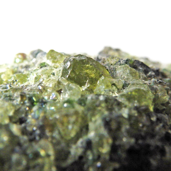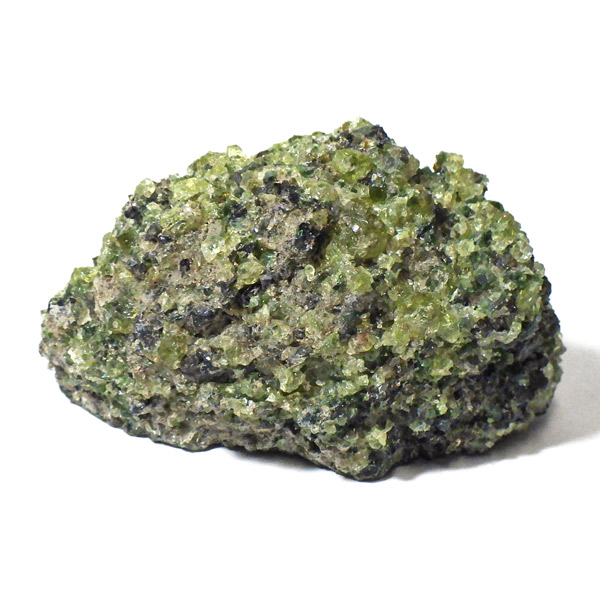 アメリカ・アリゾナ州産のペリドット(ペリドタイト)母岩付き原石です。鉱物名をオリビンと呼ぶのですが、日本では宝石名のペリドットが浸透しています。和名は橄欖(かんらん)石といいます。主にグリーンの結晶がかんらん石でチャコールグレーの母岩が玄武岩です。かんらん石は月の岩石や石質隕石、石鉄隕石にも含まれており、鉄の含有量によって、白色から黒色まで色調が変化します。かんらん石は地球の上部マントルの主要構成鉱物でマグマの噴火によって溶岩の塊に運ばれて地表に出てきます。まさにその姿を切り取ったようなこの原石は、様々な濃淡の結晶が多面にわたり観察できます。