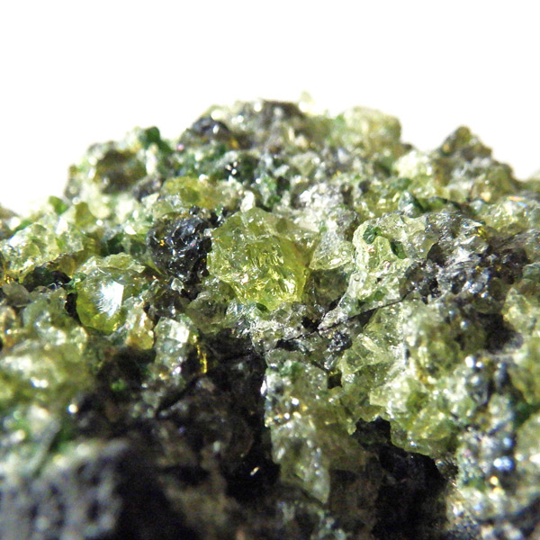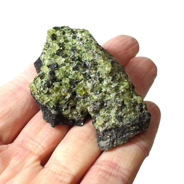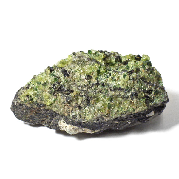 アメリカ・アリゾナ州産のペリドット(ペリドタイト)母岩付き原石です。鉱物名をオリビンと呼ぶのですが、日本では宝石名のペリドットが浸透しています。和名は橄欖(かんらん)石といいます。主にグリーンの結晶がかんらん石でチャコールグレーの母岩が玄武岩です。かんらん石は月の岩石や石質隕石、石鉄隕石にも含まれており、鉄の含有量によって、白色から黒色まで色調が変化します。かんらん石は地球の上部マントルの主要構成鉱物でマグマの噴火によって溶岩の塊に運ばれて地表に出てきます。まさにその姿を切り取ったようなこの原石は、様々な濃淡の結晶が多面にわたり観察できます。