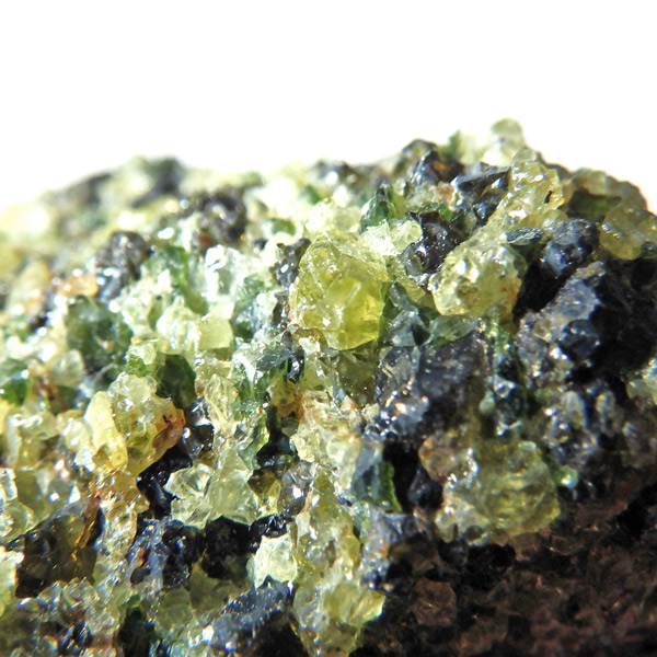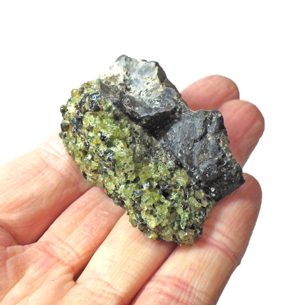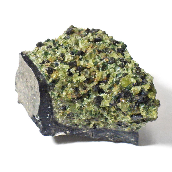 アメリカ・アリゾナ州産のペリドット(ペリドタイト)母岩付き原石です。鉱物名をオリビンと呼ぶのですが、日本では宝石名のペリドットが浸透しています。和名は橄欖(かんらん)石といいます。主にグリーンの結晶がかんらん石でチャコールグレーの母岩が玄武岩です。かんらん石は月の岩石や石質隕石、石鉄隕石にも含まれており、鉄の含有量によって、白色から黒色まで色調が変化します。かんらん石は地球の上部マントルの主要構成鉱物でマグマの噴火によって溶岩の塊に運ばれて地表に出てきます。まさにその姿を切り取ったようなこの原石は、様々な濃淡の結晶が多面にわたり観察できます。