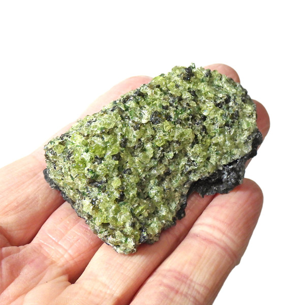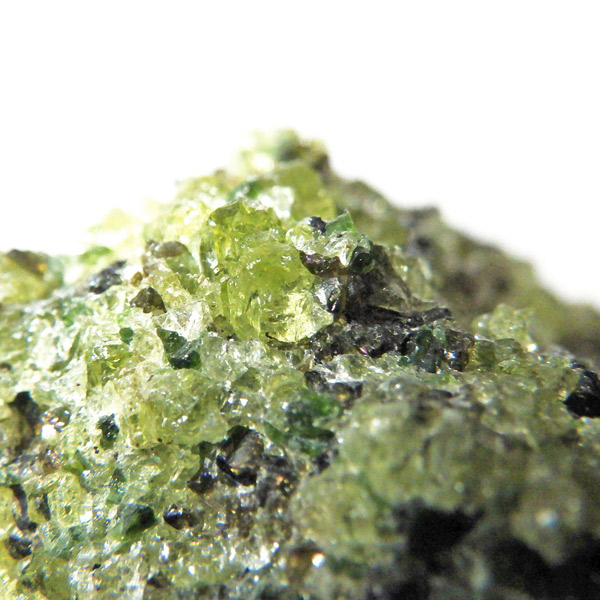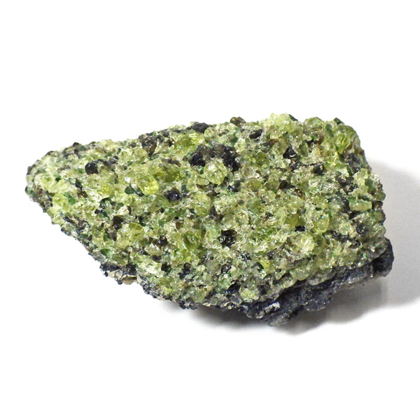 アメリカ・アリゾナ州産のペリドット(ペリドタイト)母岩付き原石です。鉱物名をオリビンと呼ぶのですが、日本では宝石名のペリドットが浸透しています。和名は橄欖(かんらん)石といいます。主にグリーンの結晶がかんらん石でチャコールグレーの母岩が玄武岩です。かんらん石は月の岩石や石質隕石、石鉄隕石にも含まれており、鉄の含有量によって、白色から黒色まで色調が変化します。かんらん石は地球の上部マントルの主要構成鉱物でマグマの噴火によって溶岩の塊に運ばれて地表に出てきます。まさにその姿を切り取ったようなこの原石は、様々な濃淡の結晶が多面にわたり観察できます。